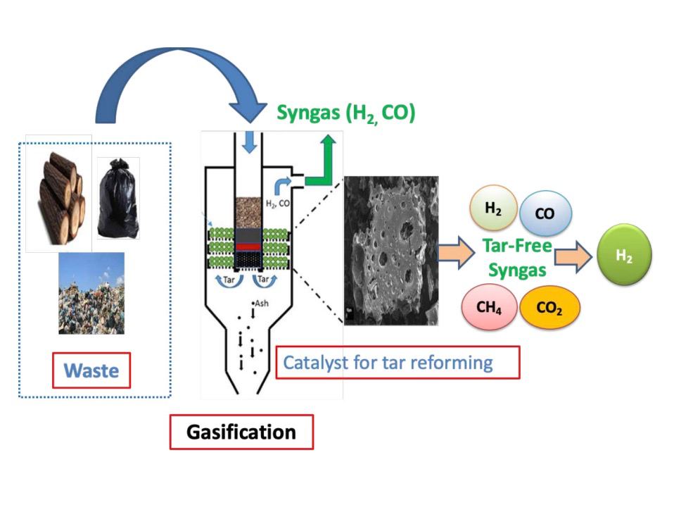 The project investigates the pyrolysis/gasification of waste tire using a novel catalyst to generate a hydrogen-rich syngas through a gas-solid simultaneous reforming/gasification process. Syngas can be used for hydrogen, power and heat generation. A two-stage pyrolysis-reforming fixed bed reactor was used to carry out the process. The influence of temperature, sample particle size, catalyst and steam addition on hydrogen production were investigated. At the end of each reaction cycle, the pyrolysis contents like gas, liquid and carbon black were weighed and calculated through mass balance equation. The formed liquid fraction was characterized using GC-MS. The obtained oil was compared with different fuel oil to check the validity of pyrolytic oil as a raw material for different chemicals and in an oil feedstock for the petrochemical industry. The obtained gas was analysed using GC. The carbon black was characterized using Scanning electron microscopy (SEM) for morphology of carbon, energy dispersive X-ray analysis (EDX) for elemental composition. A two-stage fixed bed reactor was needed to carry out the process.