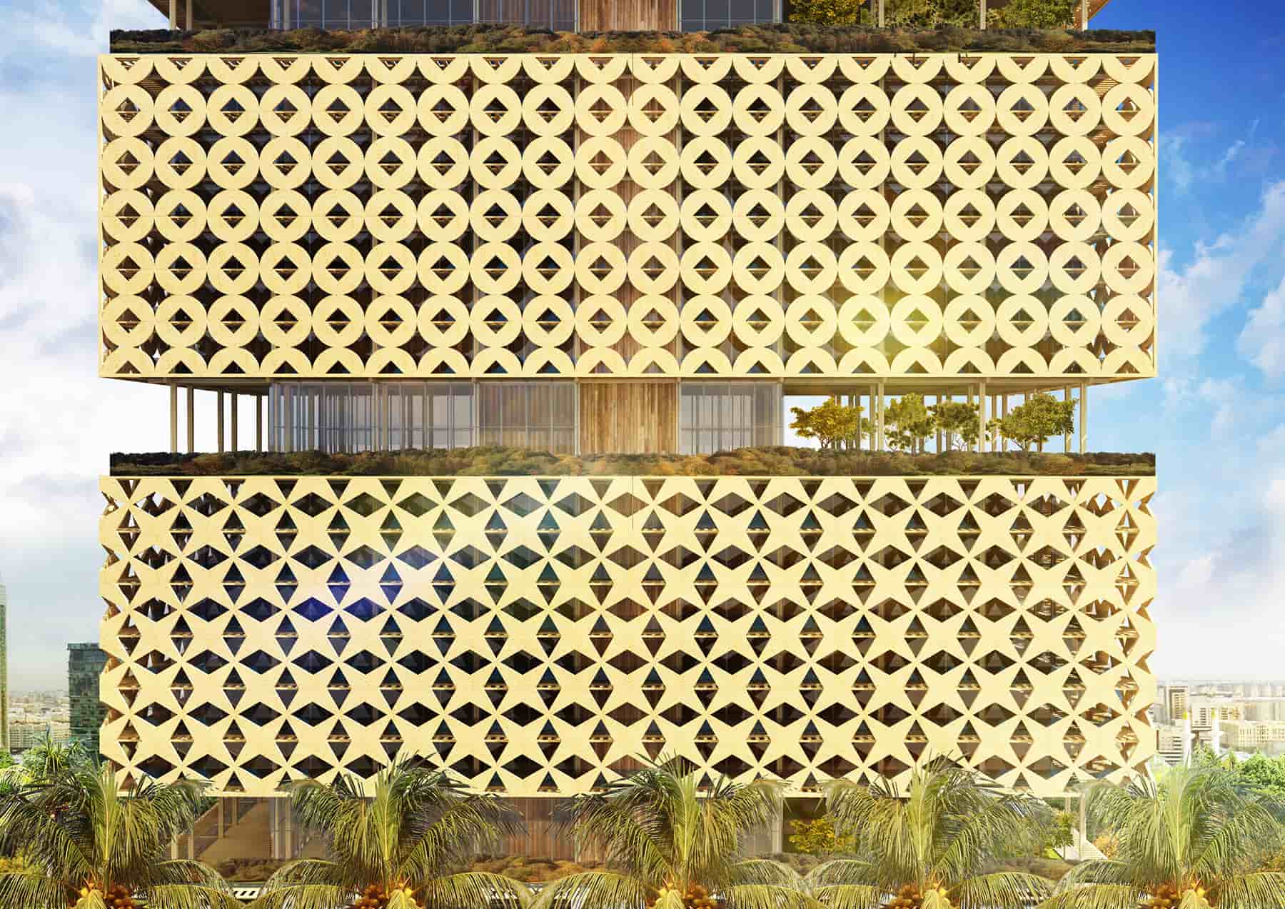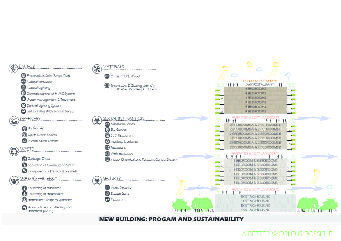 Lagos’s tower rises above the town and follow the sky and search to cross the limit of wooden construction. The new landmark is composed of mixed residential type used; it is built on the roof of Abebe Court, a housing estate. The whole is oriented to maximize daylight and natural ventilation. The wooden envelope provides shading from the heat of the direct sun around the shape. Plants belt around each floor contribute to creating fresh air flow and keep a constant microclimate into living space while providing a visual comfort and aesthetic. The project focuses on the open area. This is an experimental tall wooden structure in Lagos. The apartments are designed around a central core. Building is divided in 4 parts. The existing structure and new are separated by sky gardens and amenities. The top roof consists of 360° restaurants and lush greenery. Sky gardens also contribute in social gathering between users. It gives a new natural footprint face to the historic Centre dominated by massive and heavy building built in ceramic, concrete and asphalt.