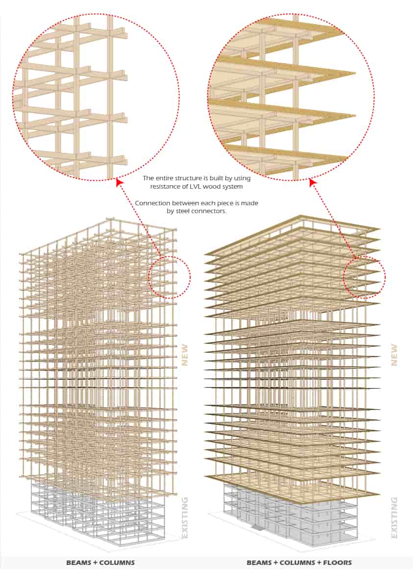 With this project, Architectural contribution is bringing a wood building tower and wood construction technic into a landscape dominated by concrete buildings. Nigeria benefits of the tropical rainforest from the central to the southern part of Nigeria. Lagos is in the south and belongs to the rainforest; why we cannot build in wood? Aside All, wood is not the only material, but it is efficient and appropriate for this region of the world. The nonsense is why do you have a potential of rainforest and you decide to don’t used it? The aim is to benefit of the power of wood in term of sustainability. In the tower, the entire structure is built by using resistance of LVL wood system. Wood will be used for load-bearing and non-load bearing structure. Structural feasibility is based on LVL products that will allow us to cross very far-reaching. Wood is Mother Nature’s fingerprints that make our buildings connect us to nature in the built environment. Architecture has sometimes a sense and sometimes none, not because it can be interpreted as a shit, no, but because it is a creative process. Sometimes we need to reinvent the world and that is what we decide to do in Lagos. Shortly, in this project, wood is not only important for its structural properties. Wood is important for its aesthetic, its cultural impact; importance, usability and influence in every day’s life routine. It is also a sensible, warm and soothing material. It can create an emotion into Lagos, it is also a powerful symbol. Can you imagine the first smart tall wooden building into an African city? Yes, this is also the sign of progress, technic and technological. Challenge. In the coming years, we will say, yes, we made it here. But we need to understand the project is yet as its experimental and study stage. At this step, we show you the process behind the skeleton and the project.