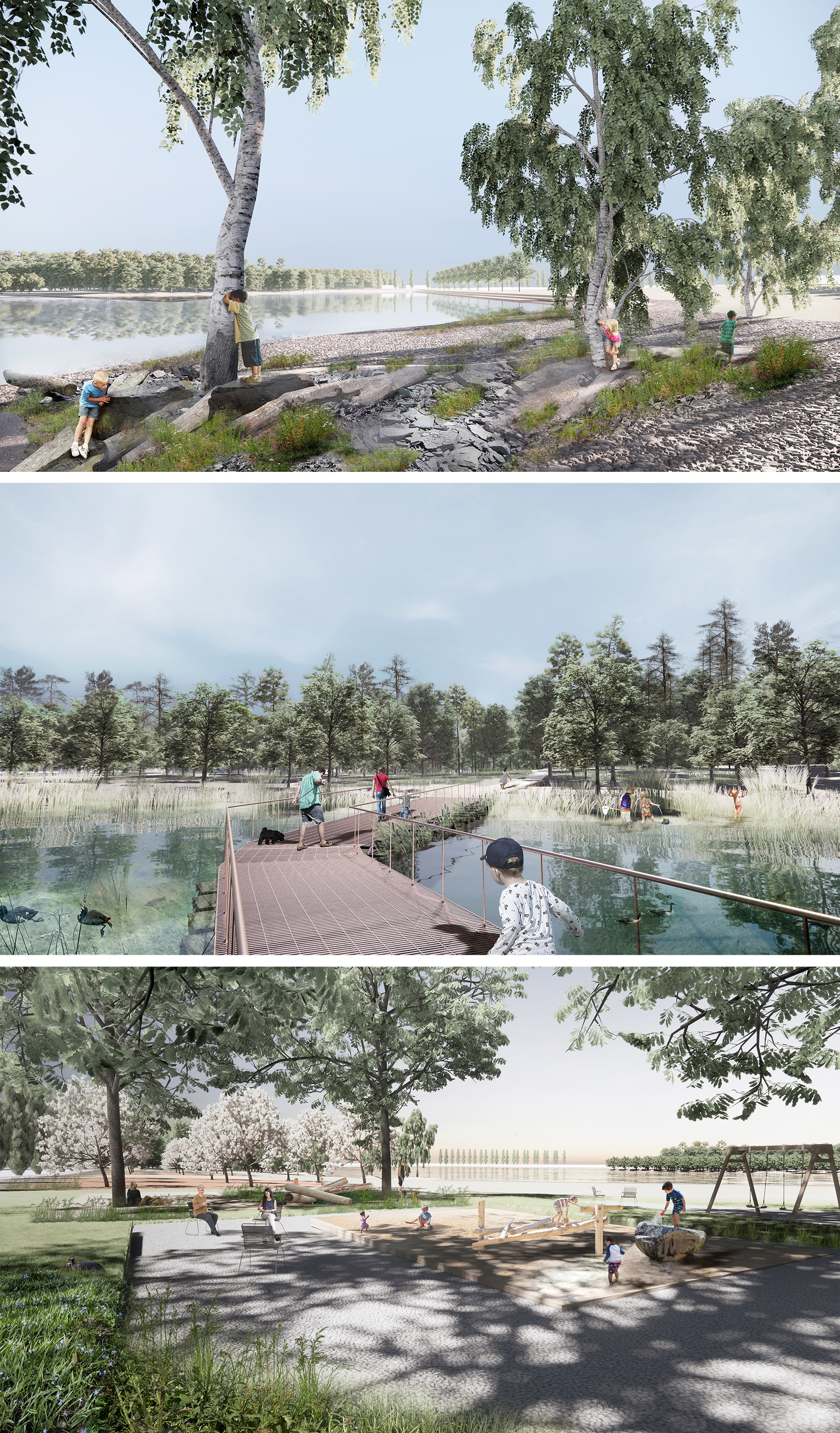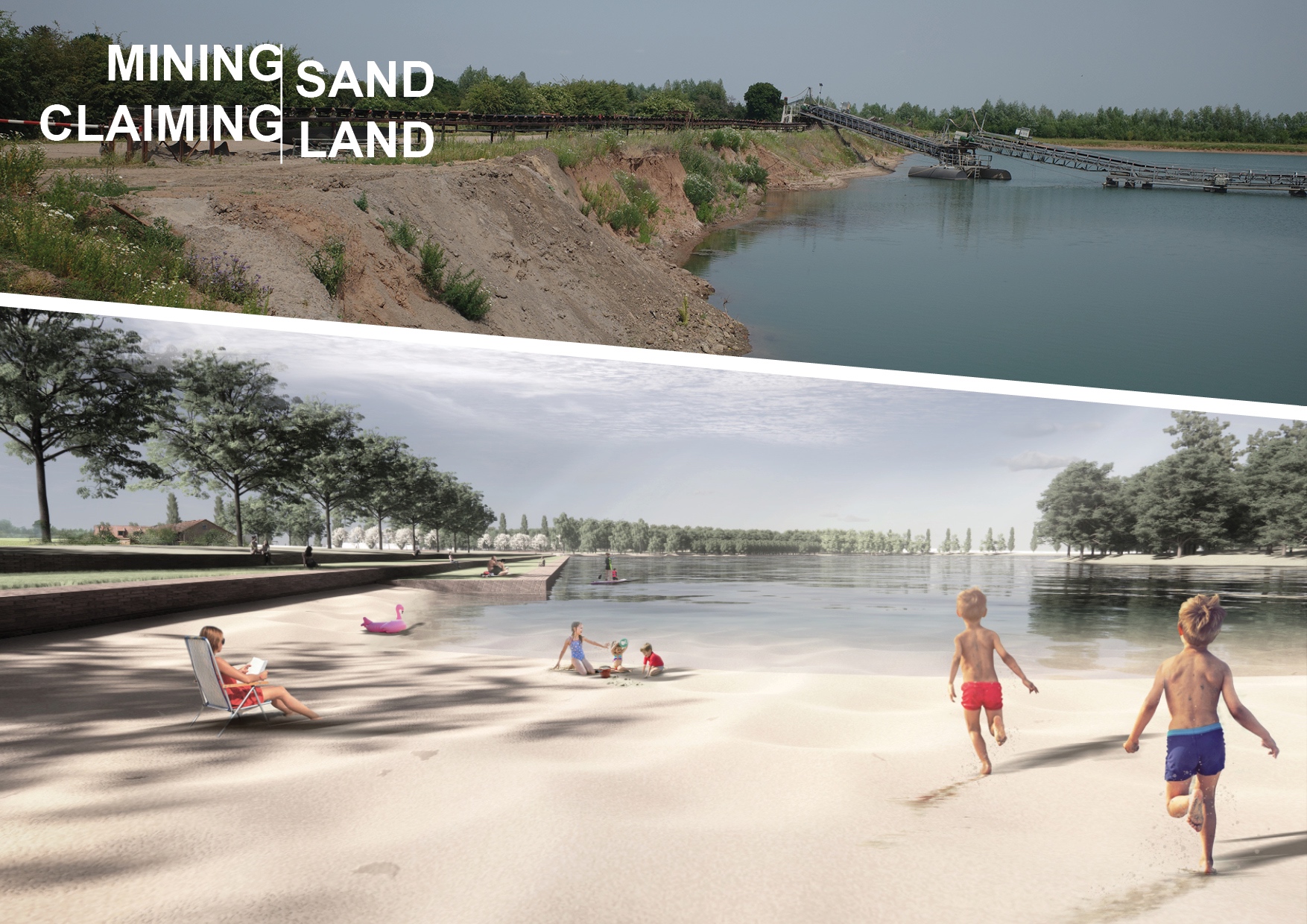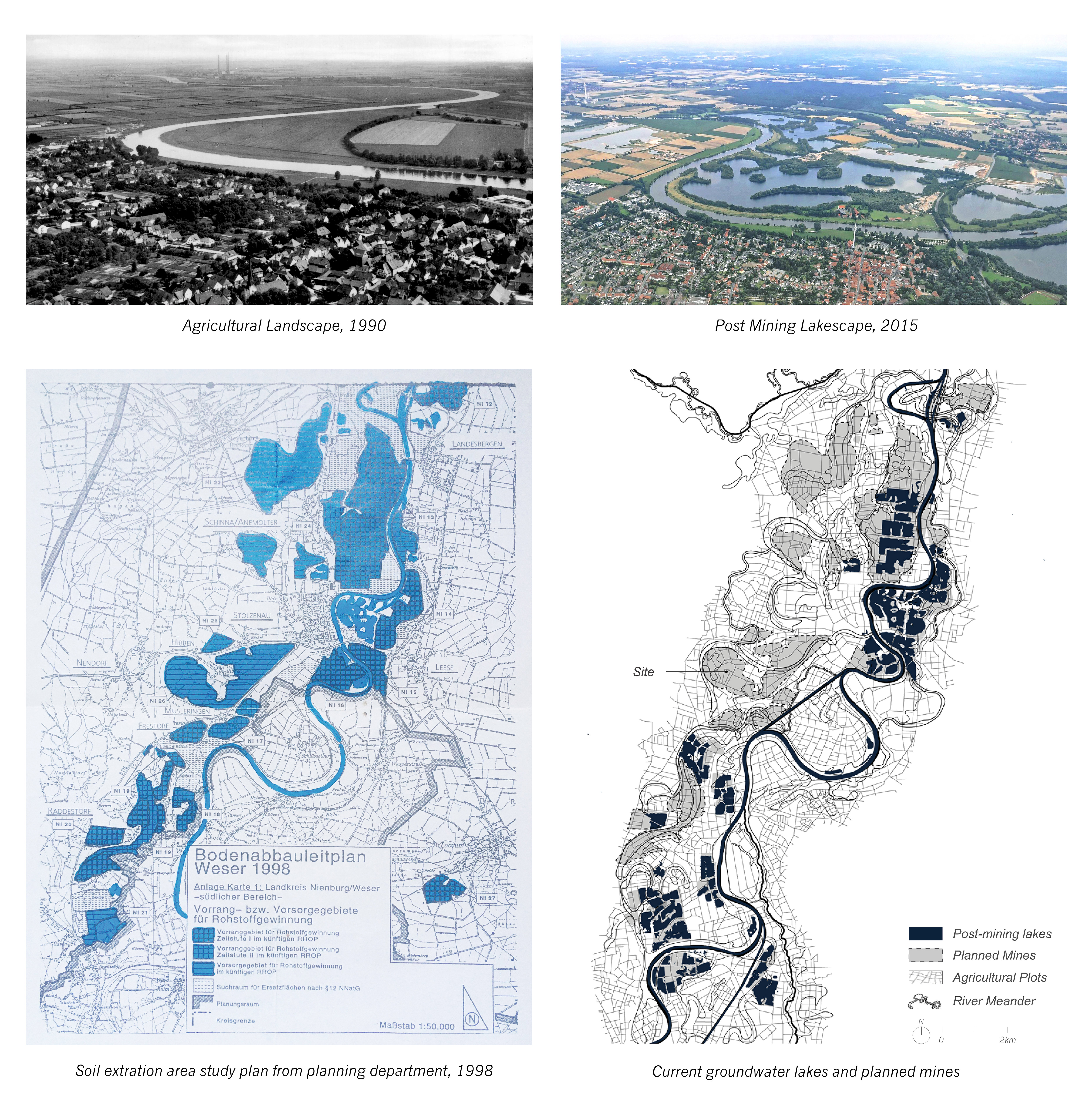 Sand is the Earth’s most heavily extracted resource, primarily for construction purposes. This extraction involves digging below the groundwater table, forming large groundwater lakes as a post-mining landscape. Typically, these lakes are left abandoned. However, this project in Mittelweser, Germany, challenges this convention by intervening before the negative consequences of mining occur and prompt positive transformation by crafting a post-mining performative landscape that brings climate resilience, new activities and cultural identity to the local community, which has contributed its land and materials to the society.