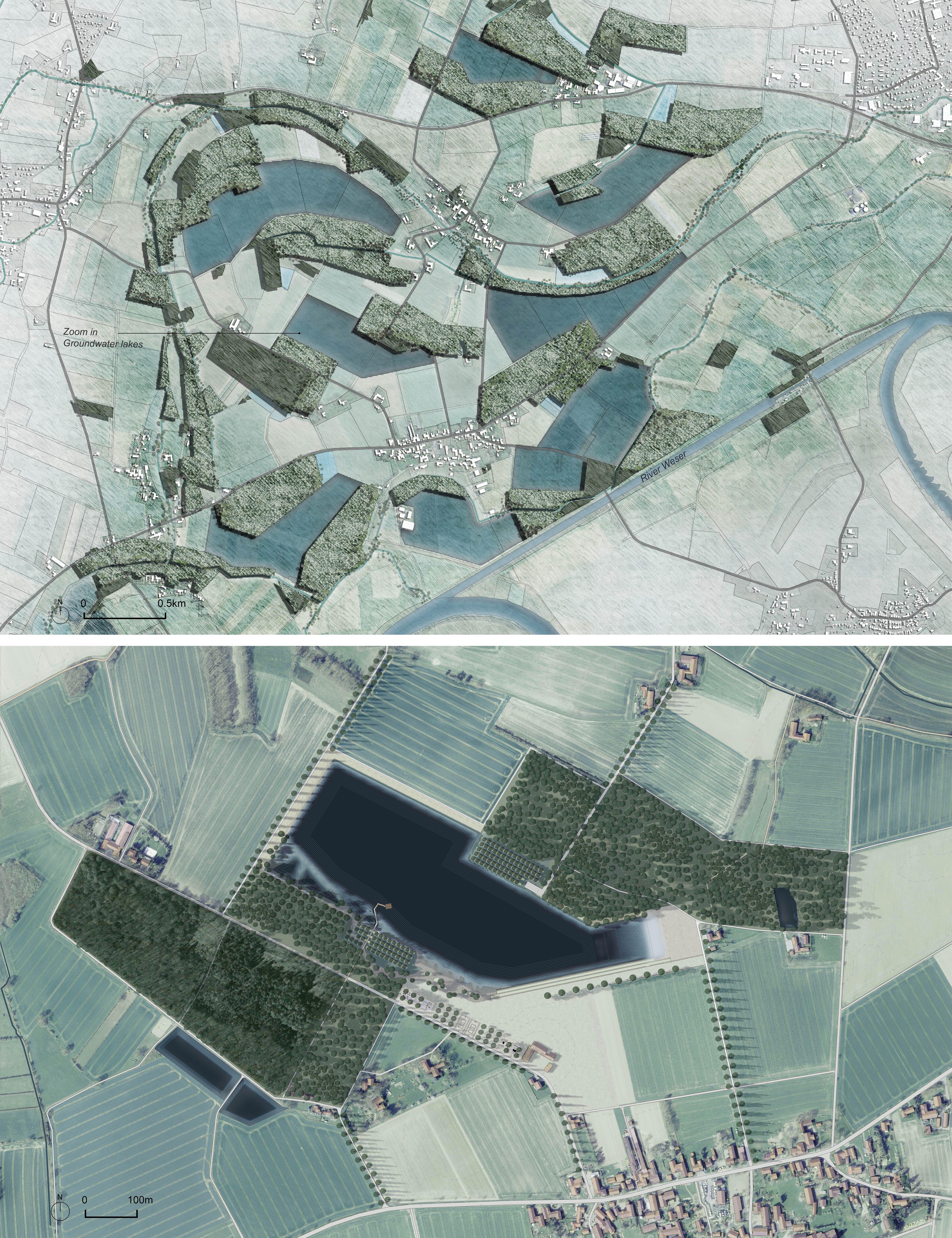 In response, this project proposes a landscape framework that unites the scattered post-mining lakes collectively into a landscape infrastructure that benefits local villagers. This approach utilizes only 50% of the current mining plan, allowing farming to coexist with the transformed landscape. The new landscape structure connects groundwater lakes with existing ditches to collect rainwater, expands forests along the lakes to create riparian flood detention zones and introduces sealed irrigation ponds for dry seasons. The master plan is aesthetically and administratively guided by farming plots which offers flexibility in implementation and echo the dynamics of the river meander.